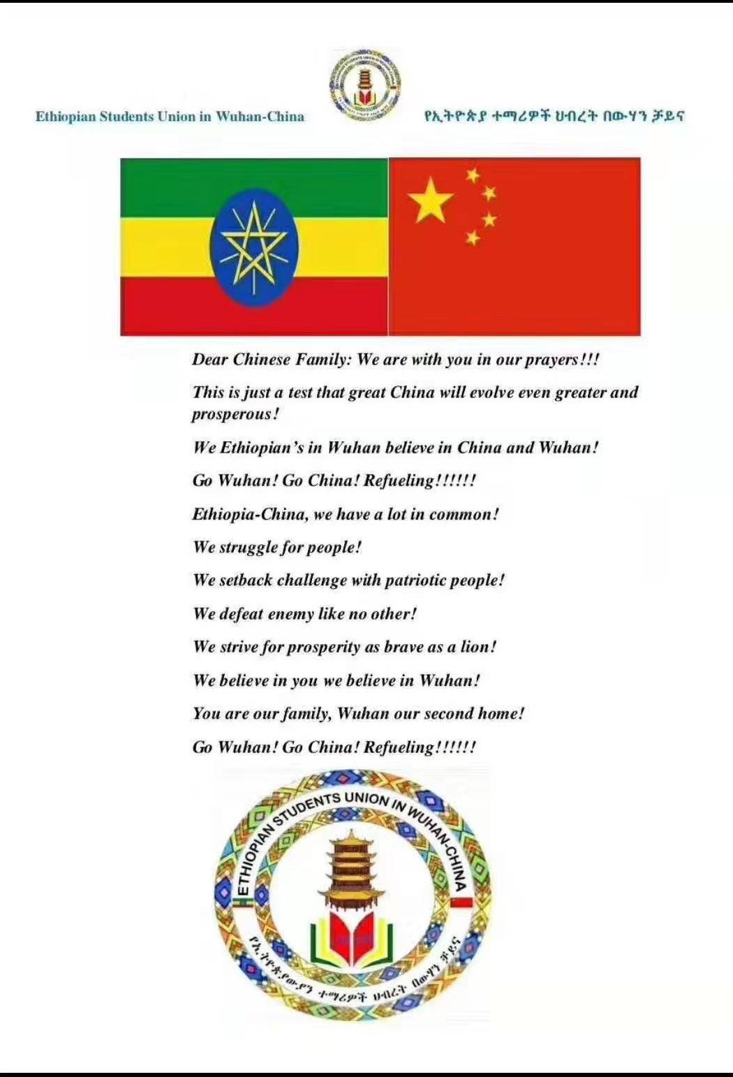 我校埃塞俄比亚留学生会主席Mohamed(马云),率所有埃塞俄比亚留学生为中国武汉祈福、为中国武汉加油!