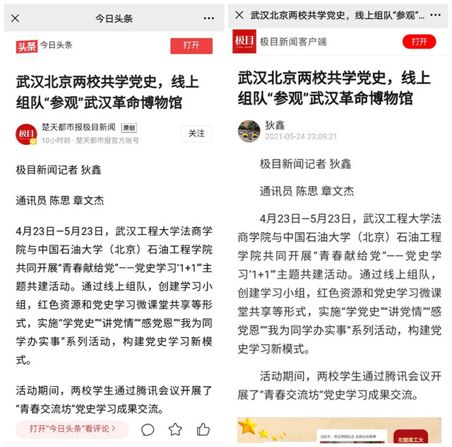 武汉工程大学法商学院的同学们前往武汉革命博物馆和毛泽东故居,与石油大的同学们线上分享党史学习教育体会,争做党史学习教育“网红博主”。